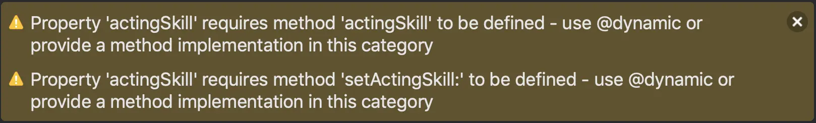 我们创建一个 Person的分类Person+Actor.h,在.h文件里新建一个新属性@property(nonatomic, assign)float actingSkill而不做其他任何处理,这时候,.m文件就会有警告。