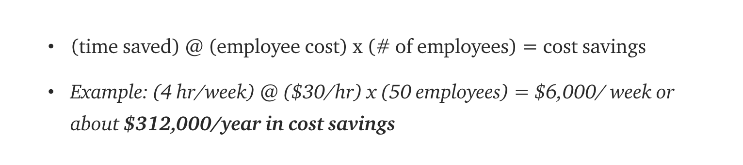 · (节省时间)@(员工成本)x(员工人数)=节省成本