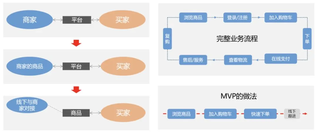 比如要开展一个电商项目,MVP的指标是用户在产品上的购买行为。先聚焦模块,再看流程,那最小可行性产品就是:查看产品——挑选产品——下单。去掉满减买赠、关联推荐、分享评论、会员积分等辅助模块,甚至把下单之后的结算、物流等后续流程也纳入线下处理,聚焦资源在核心业务的交易上,做一款MVP的产品验证指标。