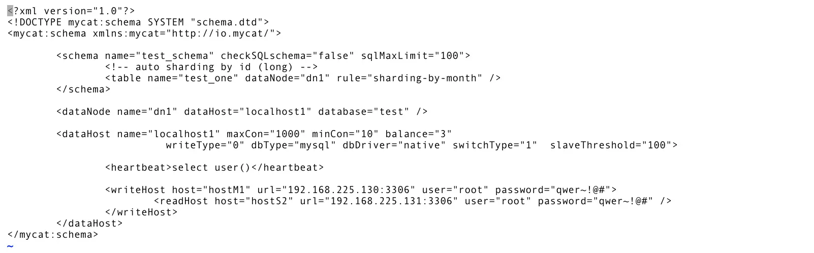 以上定义一个用户,用户名为root,密码为qwer~!@#,可访问的schema为test_schema一个逻辑库。