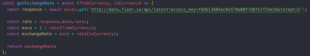 const exchangeRate = await getExchangeRate(fromCurrency, toCurrency);