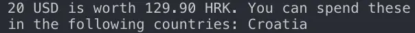 convertCurrency('USD', 'HRK', 20)