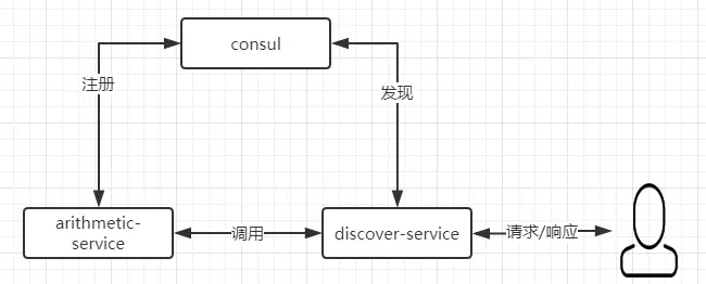本文实例程序采用的思路为:算术服务注册至consul,其他部分保持不变;发现服务对外暴露http接口,接受请求后(接收请求内容存储在Body中,以json方式传递),按照go-kit的机制动态查询算术服务实例,调用算术服务的接口,然后将响应内容返回。如下图所示: