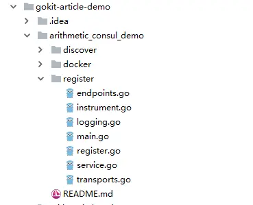 本示例基于arithmetic_monitor_demo代码进行改写。首先,复制该目录并重命名为arithmetic_consul_demo;新建两个目录,分别命名为register、discover;将原有go代码文件移动至register目录。结果如下图所示: