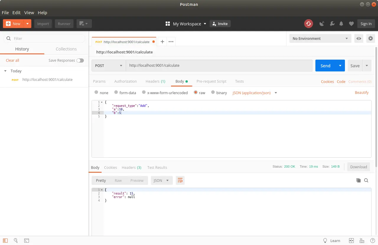 使用postman请求http://localhost:9001/calculate,在body中设置请求信息,完成测试。如下图所示: