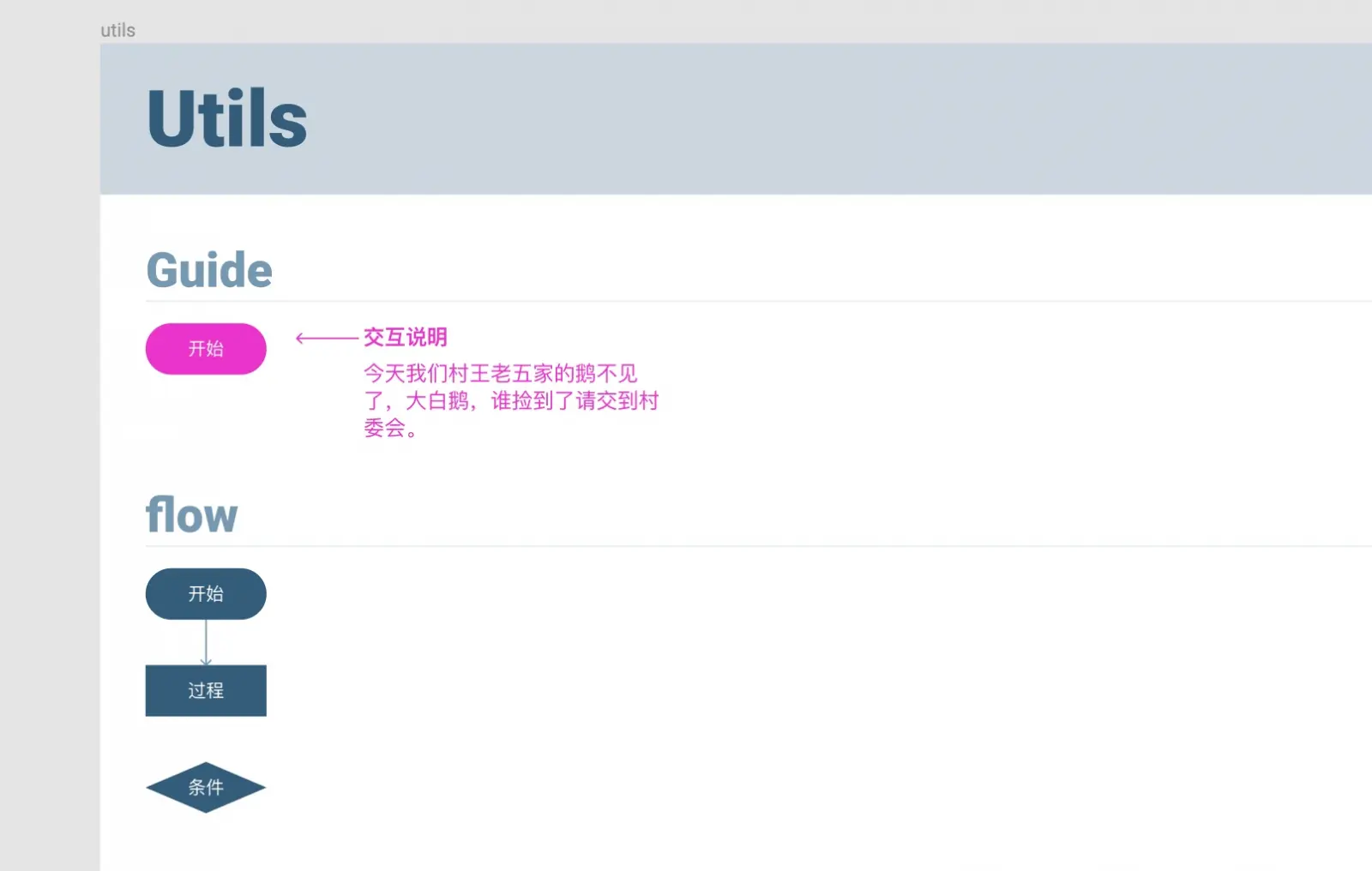 除了常规的组件分类以外,我还做了一个“Utils”分类,用来做原型上的一些辅助显示,以及流程图什么的。