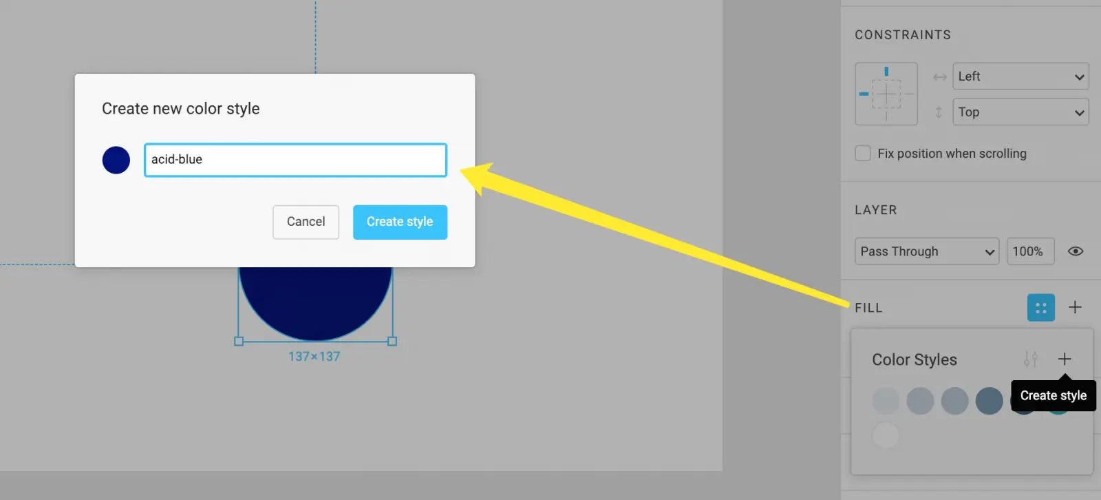Figma 支持样式和组件定义。样式是指一些常用的颜色,以及文字、投影等等,组件则是指按钮、输入框、工具提示等界面元素,类似于 Axure 中的元件库,或是 Sketch 中的 Symbol。样式库与组件库可以大大减少重复工作,提高工作效率,因此这个流程的第一步就是建立样式库和组件库。