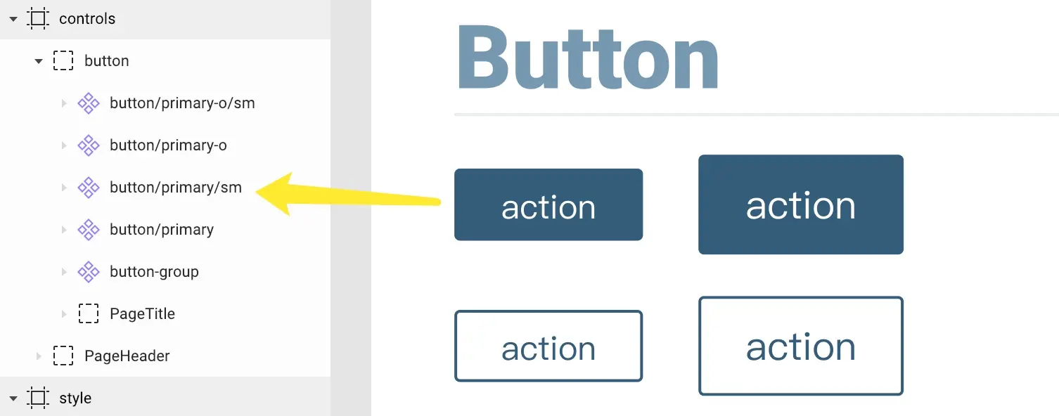 一般来说,每个组件都会有不同的状态或外观,比如按钮会有实底按钮和幽灵按钮。这个时候,我们就可以通过“/”将命名进行分隔;这样在使用时,就可以在这一系列组件中进行快速切换。比如,在下面这些按钮组件当中,“button/primary”和“button/primary-o”就分别代表了实底按钮和幽灵按钮。