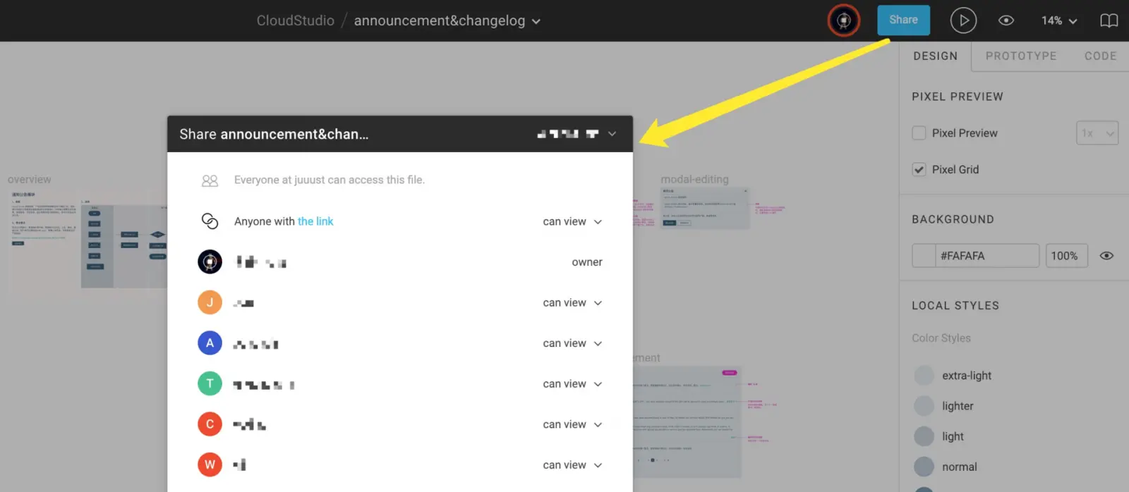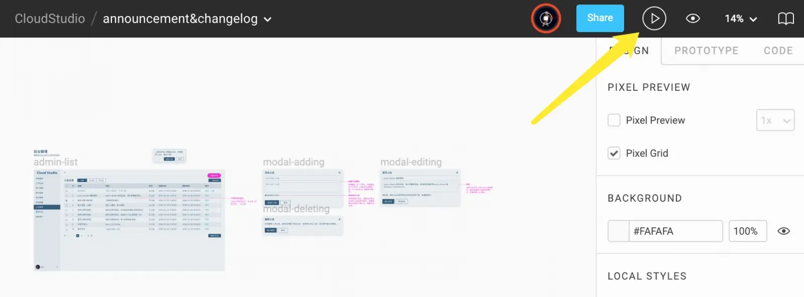 做完原型,需要交付给上下游展示时,有两种方式——产品逻辑图和可交互原型图,前者可以让上下游的同事概览整个业务逻辑和要点,后者则可以更直观的展示交互操作。交付时只需要点击顶部菜单栏的 Share 按钮,获取分享链接,将其发给其他同事即可。