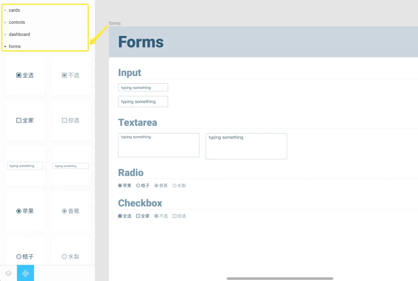 首先我会在画布中绘制一些 Frame,并通过组件类型的名称为它们进行命名,比如“Controls”、“Forms”、“Overlays”等等,每个 Frame 代表一个大类。然后我将同一大类的组件放到一个 Frame 里面,比如输入框、多选框要放进“Forms”中。