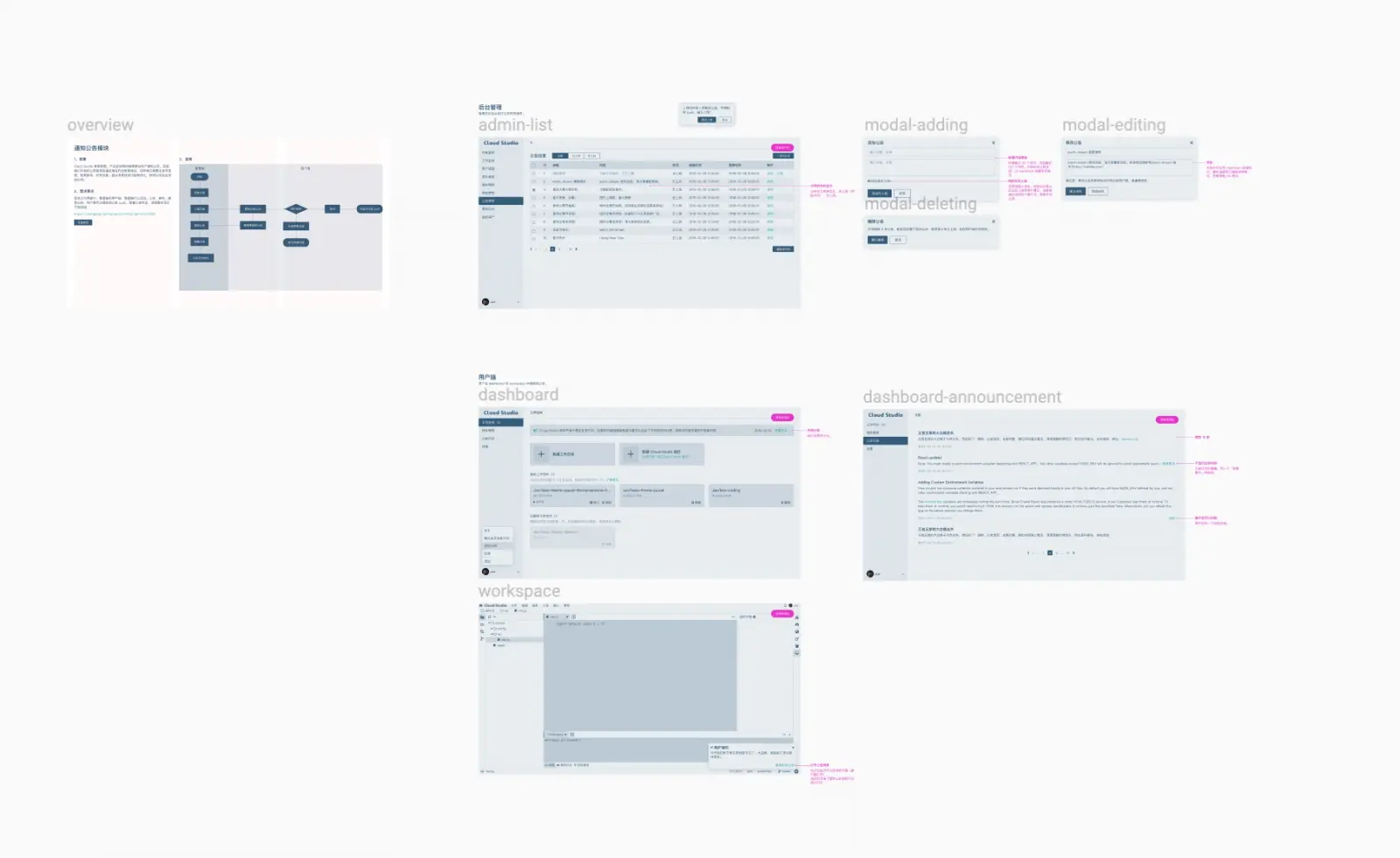 产品逻辑图其实就是你在画布当中所绘制的整体。我习惯先绘制一个 overview 来简要介绍需求背景,以及业务流程。再用页面去展示业务逻辑,并使用前面 Utils 里面的交互说明组件(下图粉色文字)来说明一些需要注意的点。