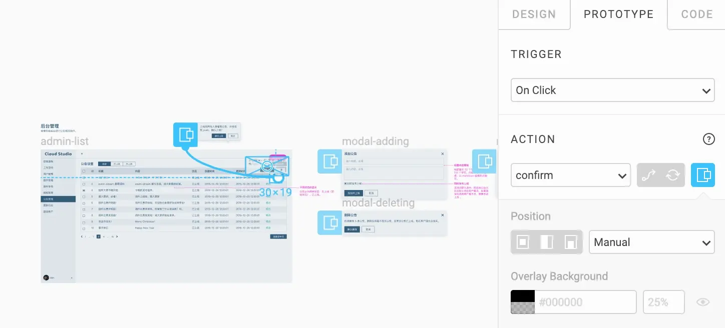Figma 支持一些基本的交互,将右侧的面板切换到 PROTOTYPE(原型)通过连线等基本操作就可以添加一些交互效果。目前支持的有页面跳转、元素切换、弹出层等,能满足一些基本的需求。