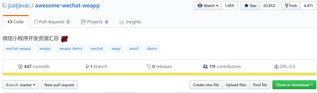 目前,awesome-wechat-weapp在GitHub上已经获得 21052 个Star,4506 个Fork(GitHub地址:https://github.com/justjavac/awesome-wechat-weapp)