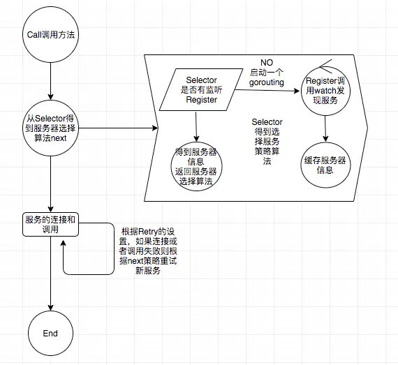 cacheSelector 会把从Register里获取的主机信息缓存起来。并设置超时时间,如果超时则重新获取。在获取主机信息的时候他会单独跑一个协程,去watch服务的注册,如果有新节点发现,则加到缓存中,如果有节点故障则删除缓存中的节点信息。当client还要根据selector选择的主机选择算法才能得到主机信息,目前只有两种算法,循环和随机法。为了增加执行效率,很client端也会设置缓存连接池,这个点,以后会详细说。