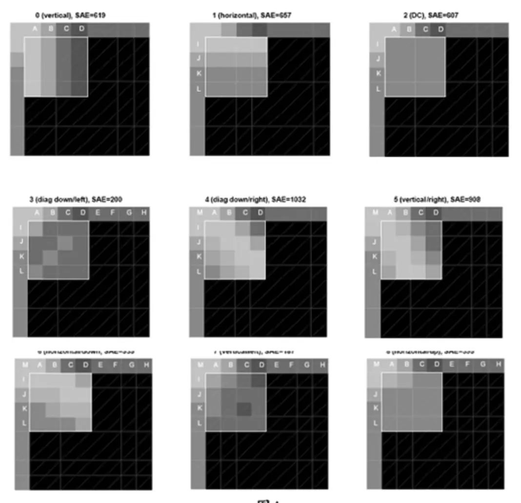 当每个宏块都选定了模式之后.就形成了下图的这样的效果.每个宏块都选择一个帧内预测的模式.帧内预测一共有9种模式.
