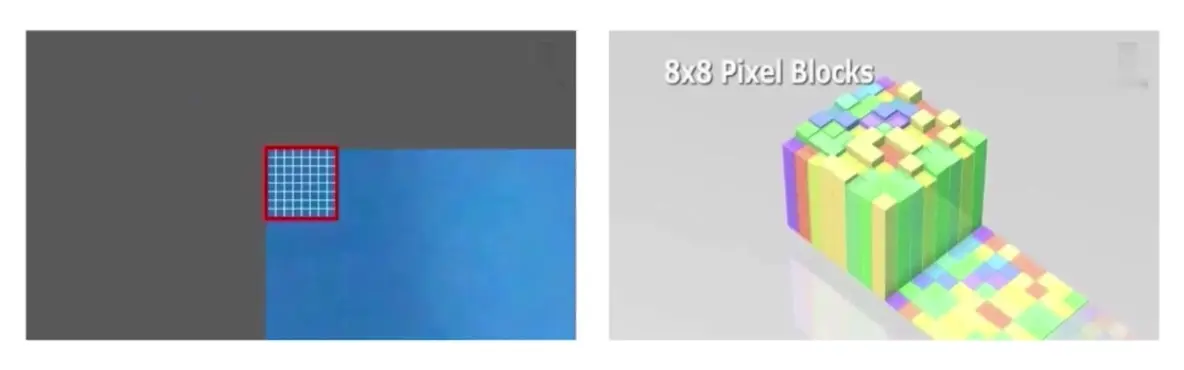 将一个图片左上角用宏块描述,就是宏块是8*8的元素.取出的颜色,像右边的去描述.描述颜色.将一个图片全部用宏块描述就如下图.