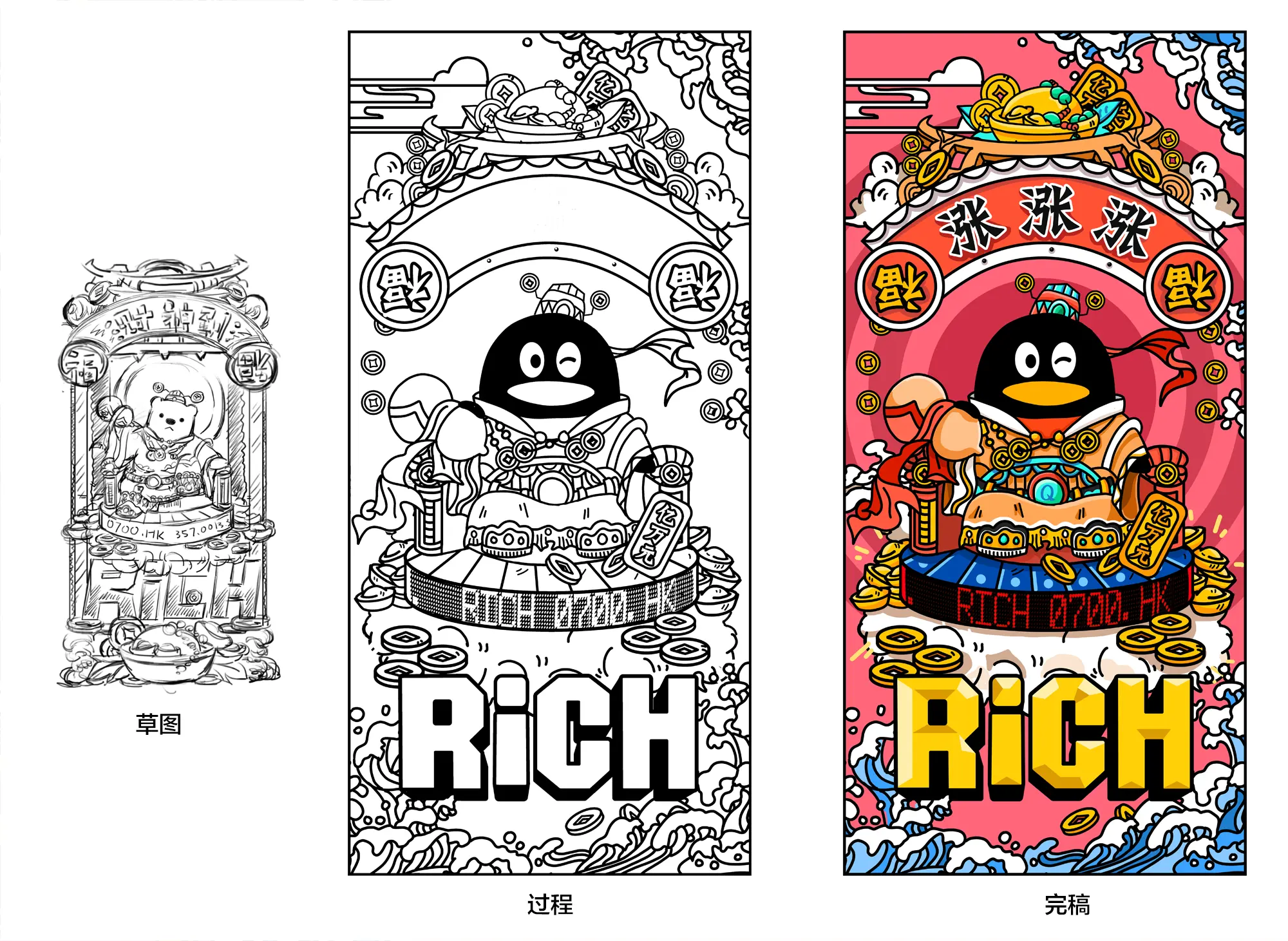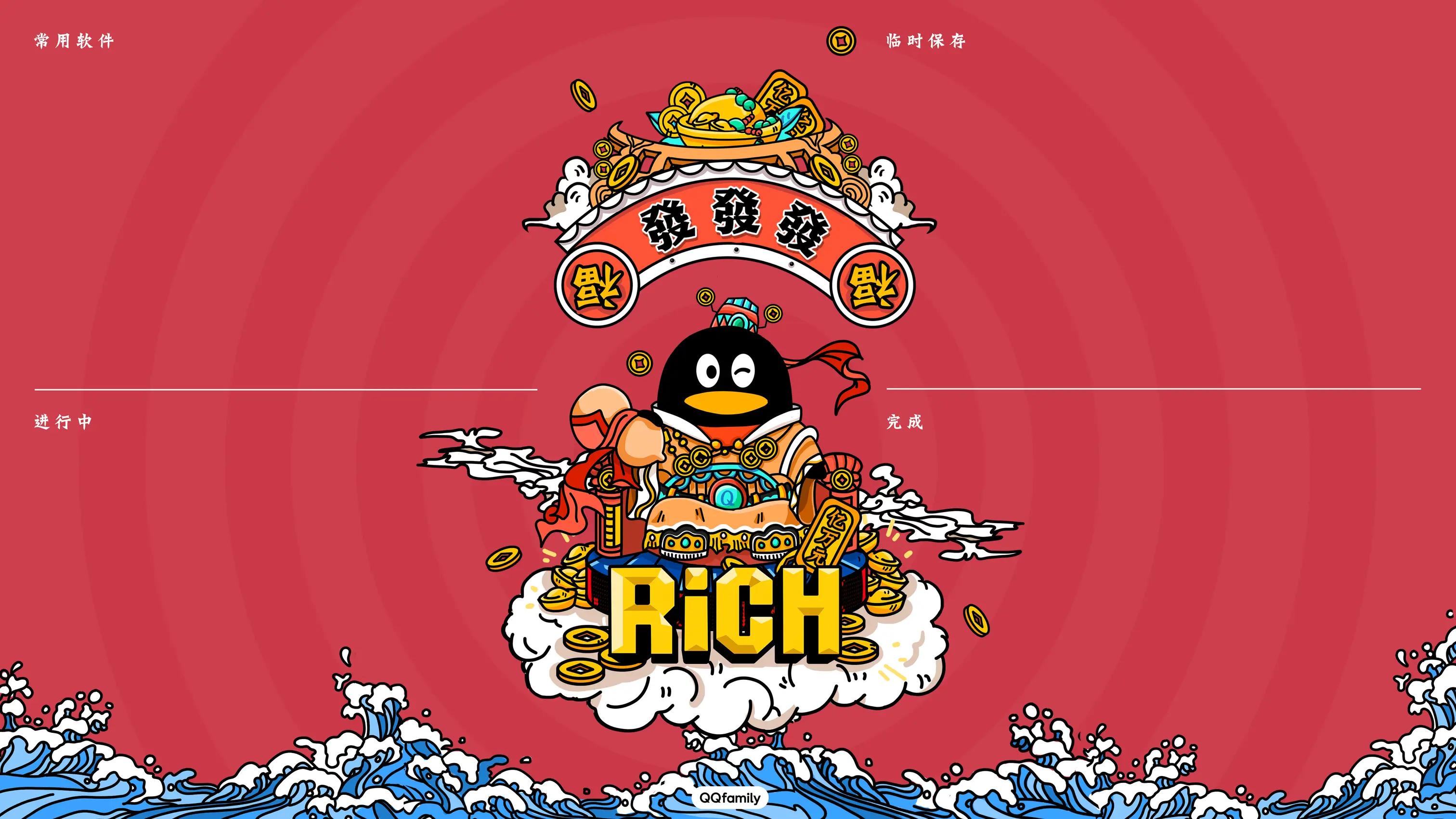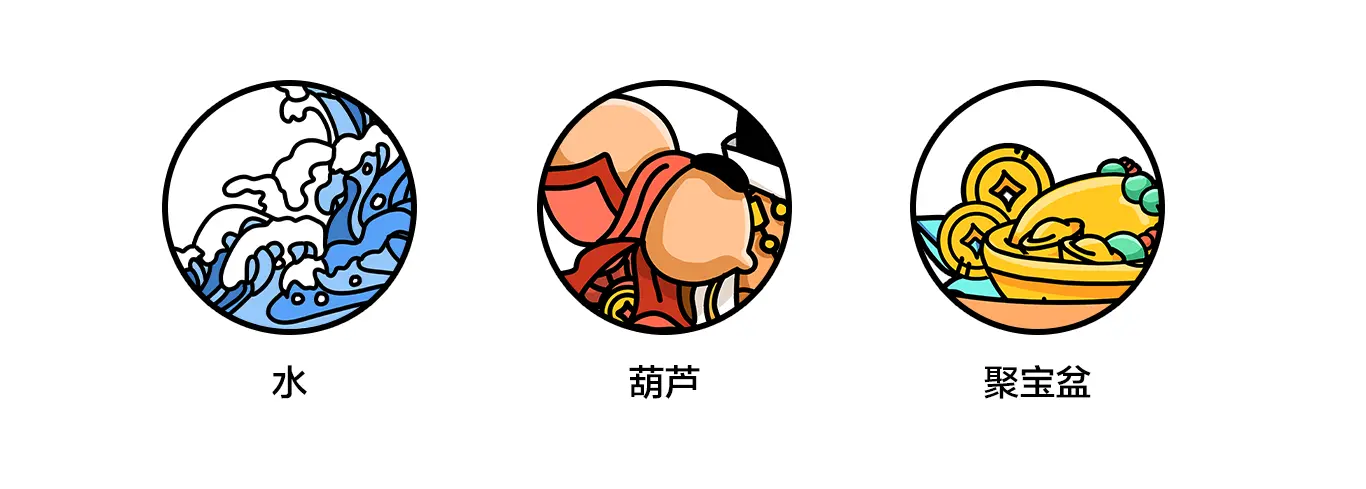 在中国传统的概念里有很多东西都能寓意着招财,所以在画面的元素方面集齐了各种会旺的元素,水围财,聚宝盆,宝葫芦,铜钱…