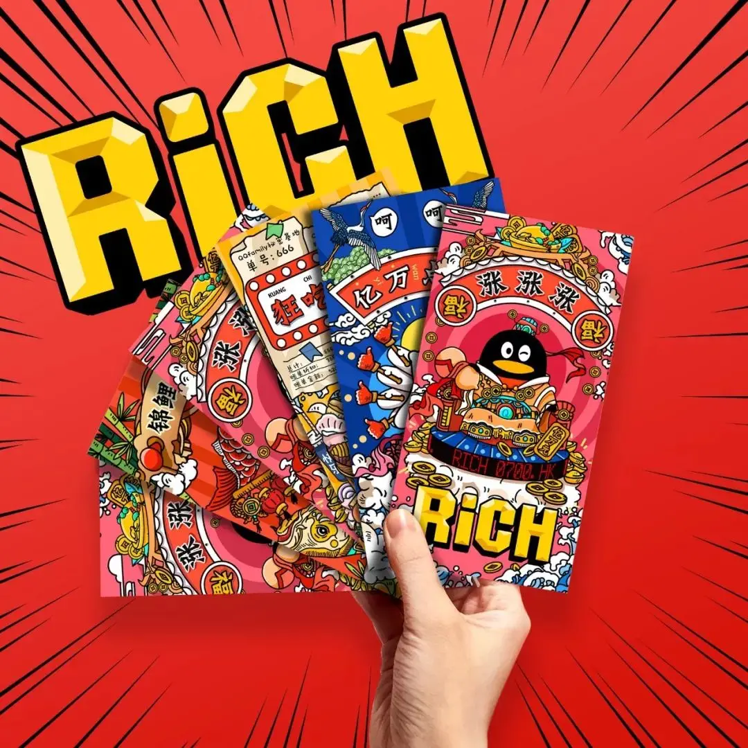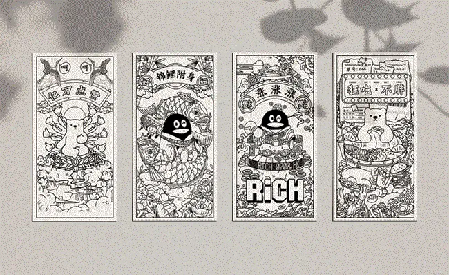 在八套福卡设计中我们选择了人气最高的四款,制作成实体红包。整套红包配色有别于传统红包的大红色,元素丰富,也更符合年轻人的口味。
