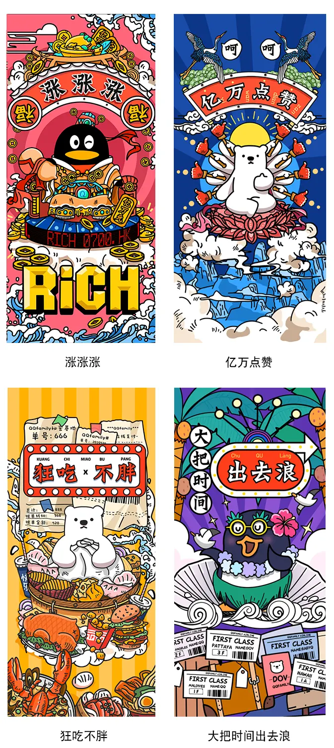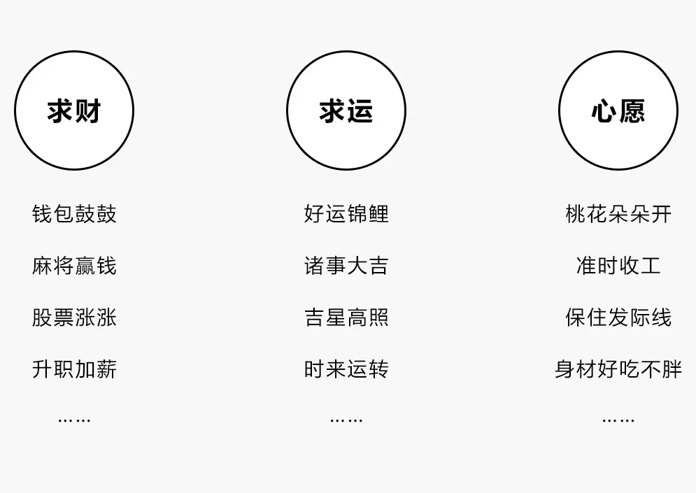 最终我们在众多主题中选取了呼声最高的八个进行设计,有普罗大众都爱的财运涨涨涨、锦鲤附身、一夜暴富、桃花旺旺、狂吃不胖,互联网人最需要的亿万点赞、当春乃发生,加班狗做梦都想要的大把时间出去浪。