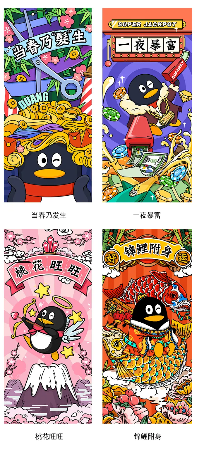 又到一年春节时,年年春节多相似,今年春节QQfamily怎样玩点不一样的概念呢?在新年的时候,总会有很多人挑选吉日去寺庙祈福许愿,给自己一个好彩头,不如我们就来凸显这股东方神秘力量吧。在这个想法下有了这次新春福卡策划。由QQfamily的有趣形象演绎不同的福卡心愿,用精美有趣的设计带来新年整年的美满期许。