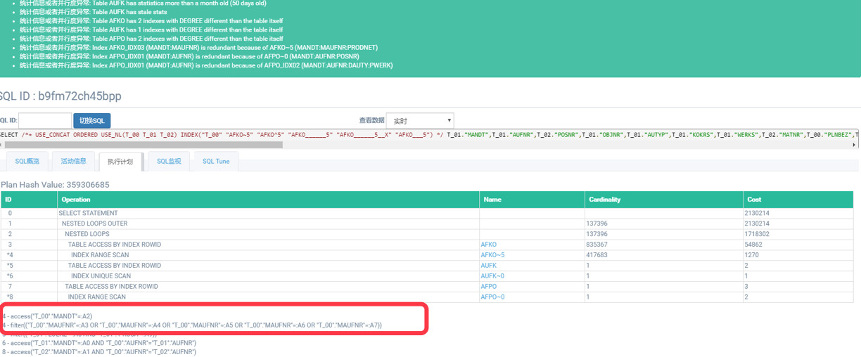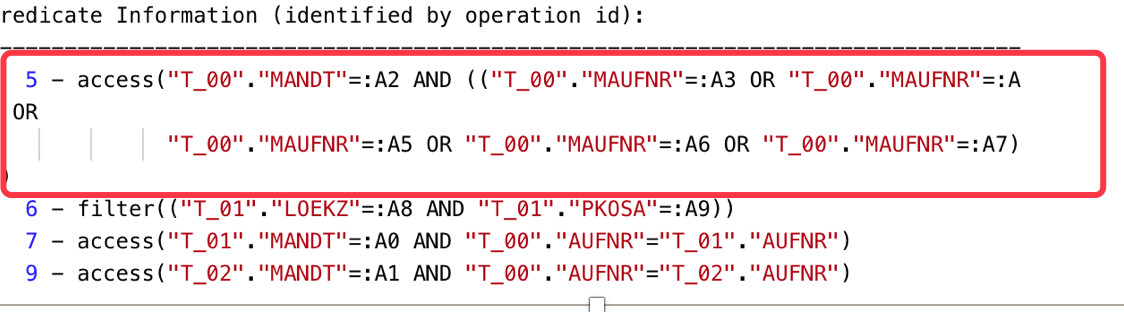 改写SQL,写法上把in展开成or,但这里SQL本身不是特别复杂的SQL,其实改写有点怪怪的,特别在应用是SAP的背景下,改写了也不可能上线,所以不太合适做解决方案。但尝试改写了分析对比执行计划的outline部分,也是不错的思路;