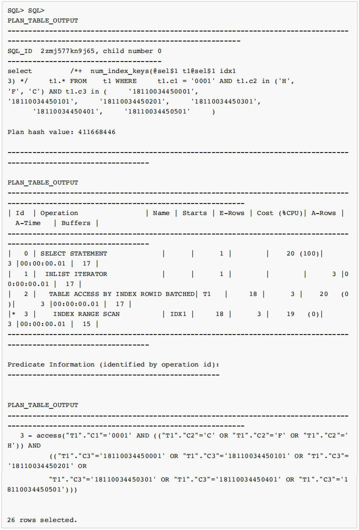这个hint指示优化器在进行“INLIST ITERATOR”操作时,可以使用多少个索引键来访问索引。下图为改后的hint,也就是将最末的位置从1改成了2: