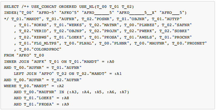 某客户一个SAP月结CO模块出现问题,通过监控已经定位到了sql,但客户dba尝试优化了数次依然没好的效果(对于含in的SQL使用了use_concat hint),客户提了SR给SAP。SAP回复加上index hint,但是对执行计划依然没有影响,SQL性能问题拖了两天,客户DBA压力很大。
