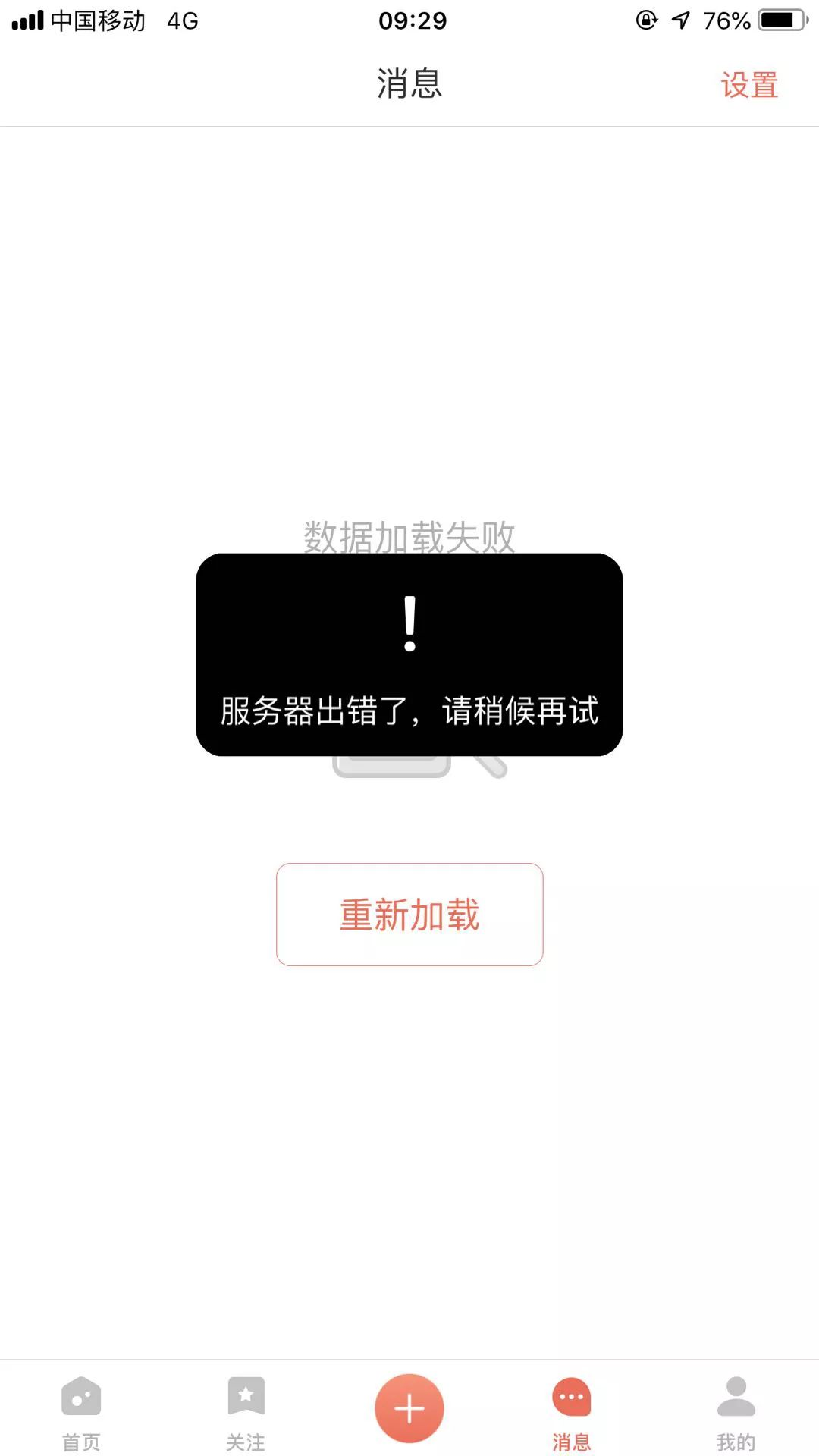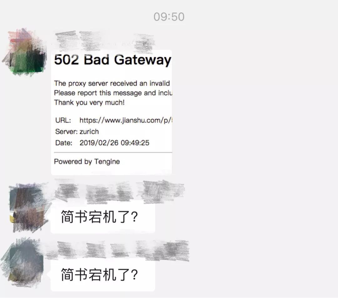 9点29分,打开简书APP,提示服务器出错,接着我又打开其他页面,以确保是否只有首页接口报错,同样提示服务器出错,我又打开简书的分享链接,无法打开,很明显,宕机了!