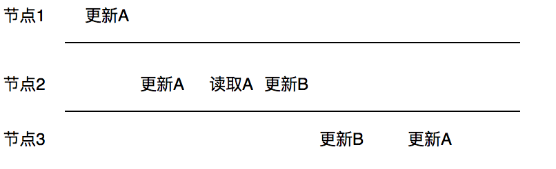 怎么理解因果关系呢?简单来说如果有人问你一个问题,那么你给出答案,这两个就是因果关系,但如果你给出答案再问题之前,那么这个就违反了因果关系。举个简单的例子如果节点1更新了数据A,节点2读取数据A,并更新数据B,这里的数据B有可能是根据数据A计算出来的,所有具备因果关系,但是如果节点3看到的是先更新的B,再更新的A那么就破坏了因果一致性。