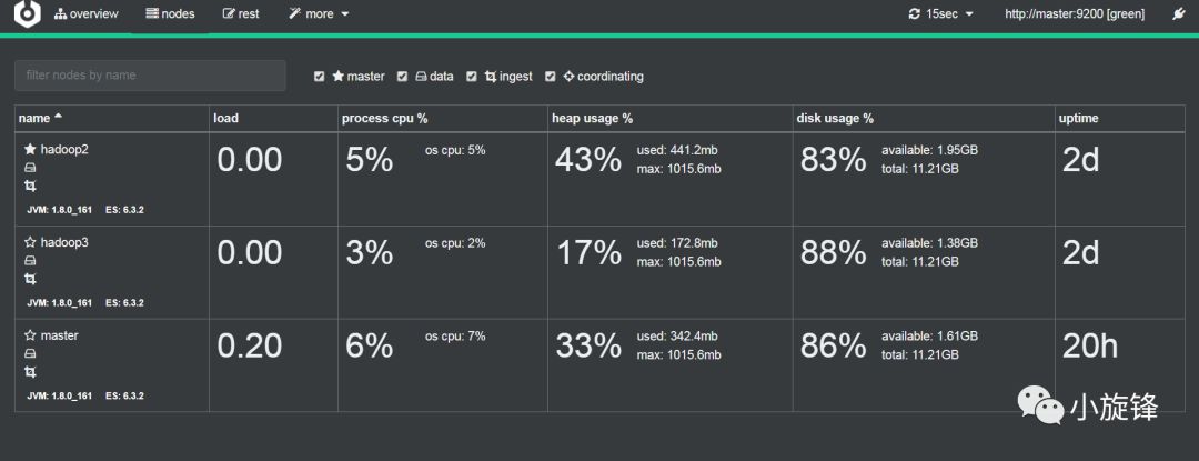 集群由 3 个节点组成,名称分别为 master,Hadoop2,Hadoop3, 其中 master 为主节点,集群状态status为 green