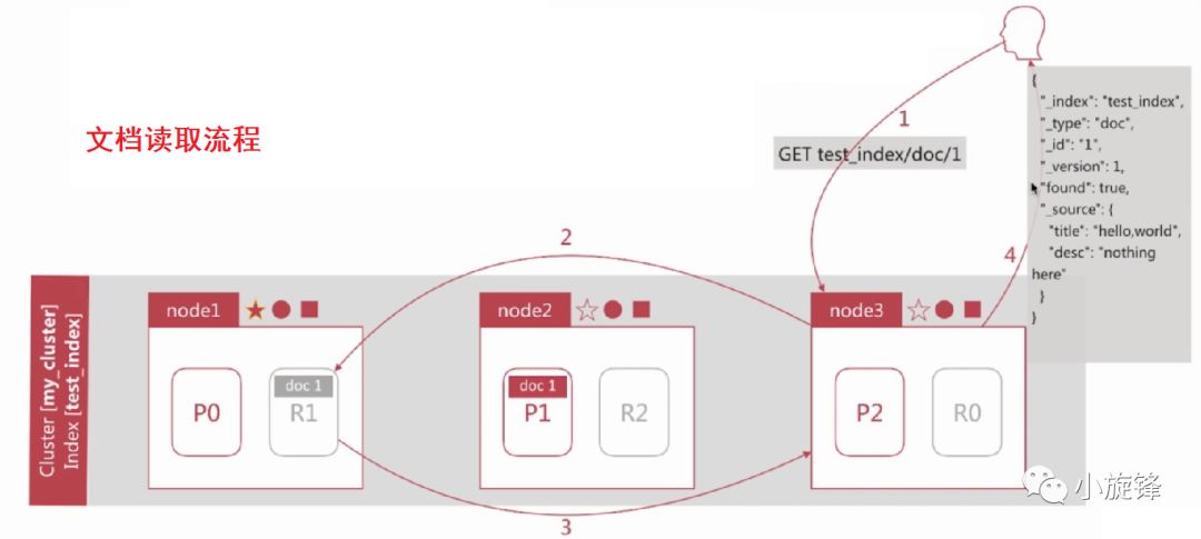 node3通过routing计算该文档在shard1上,查询cluster state后获取shard1的主副分片列表,然后以轮询的机制获取一个shard,比如这里是R1,然后转发读取文档的请求到node1