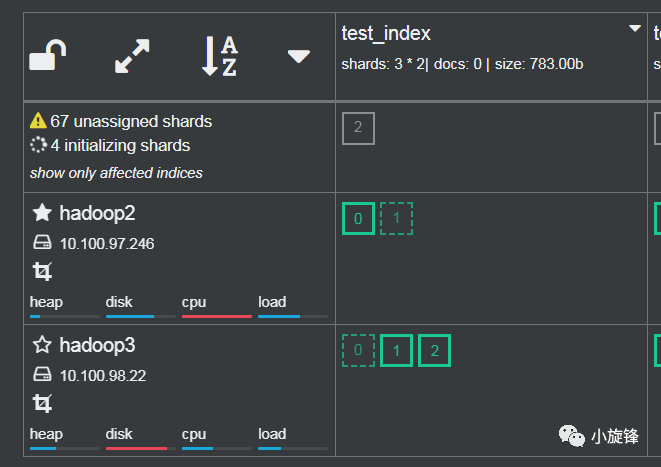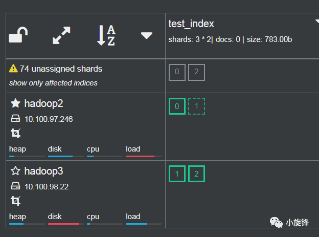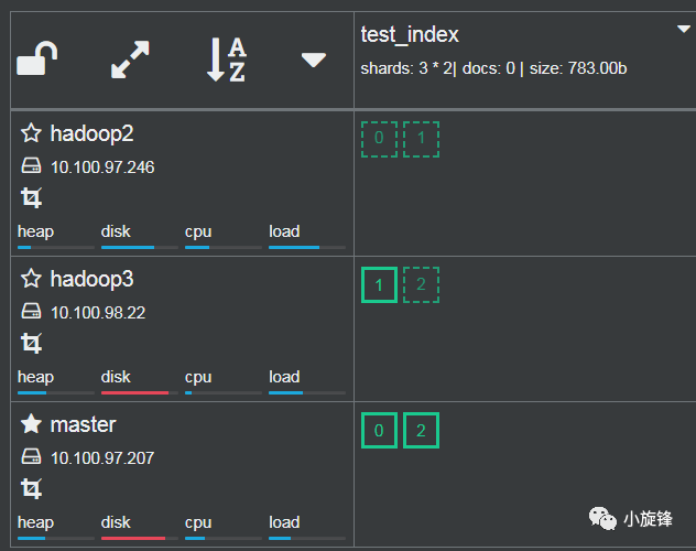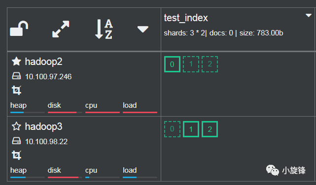 Hadoop2 和 Hadoop3 发现 master 无法响应一段时间后会发起 master 主节点选举,比如这里选择 Hadoop2 为 master 节点。由于此时主分片 P0 和 P2 下线,集群状态变为 Red
