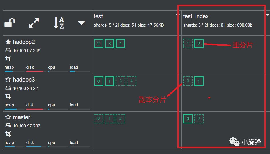 下图演示的是 3 个节点的集群中test_index的分片分布情况,创建时我们指定了3个分片和副本