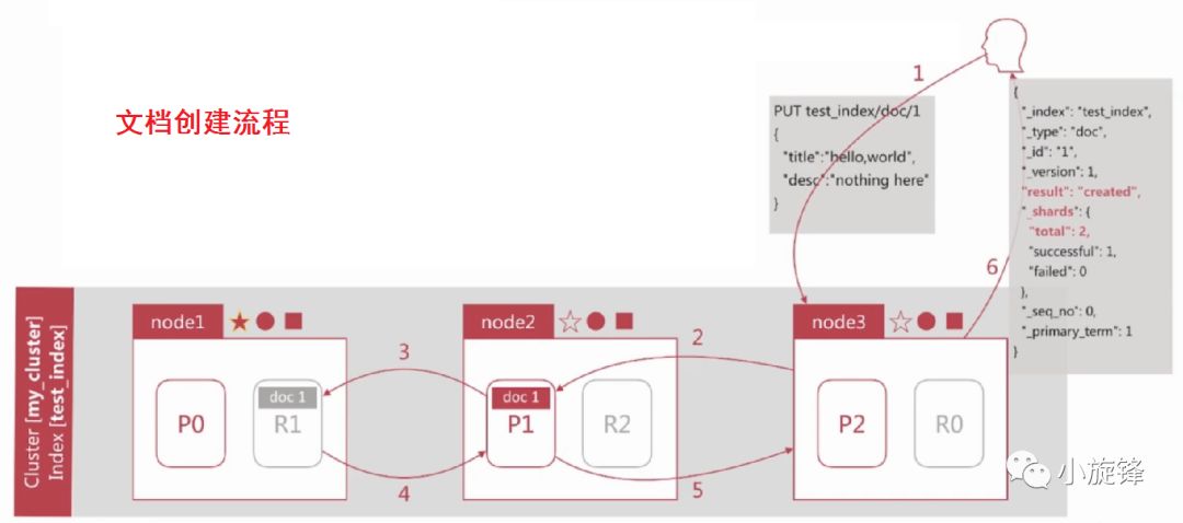 P1 接收并执行创建文档请求后,将同样的请求发送到副本分片R1
