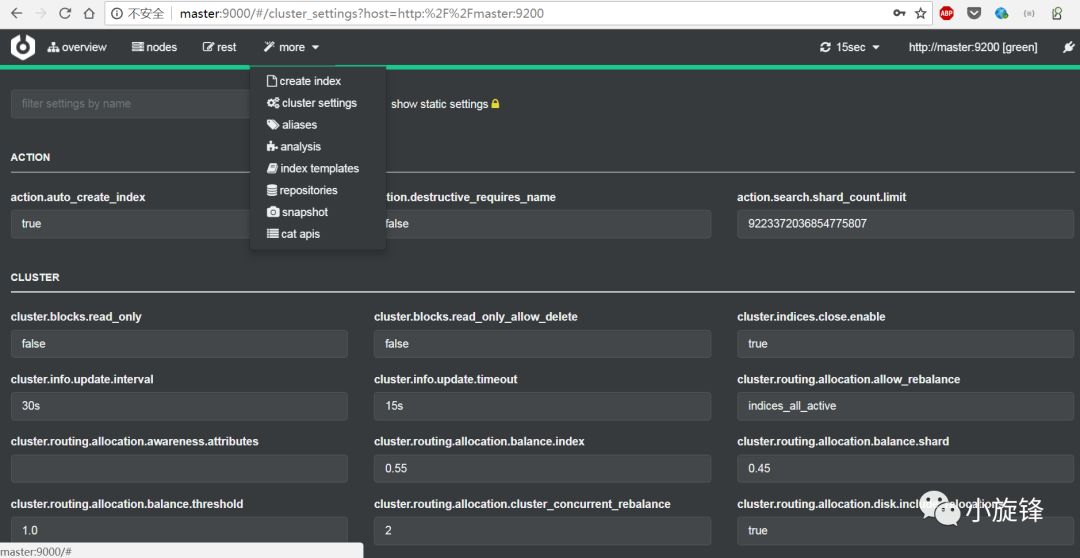 在cerebro管理界面中我们可以看到 ES节点、索引、shard的分布、集群参数配置等多种信息