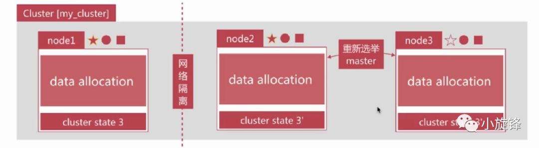 node2与node3会重新选举master,比如node2成为了新的master,此时会更新cluster state