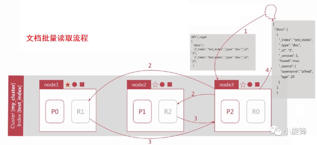 node3通过routing计算所有文档对应的shard,然后通过轮询的机制获取要参与shard,按照shard投建mget请求,通过发送请求到涉及shard,比如这里有2个shard需要参与