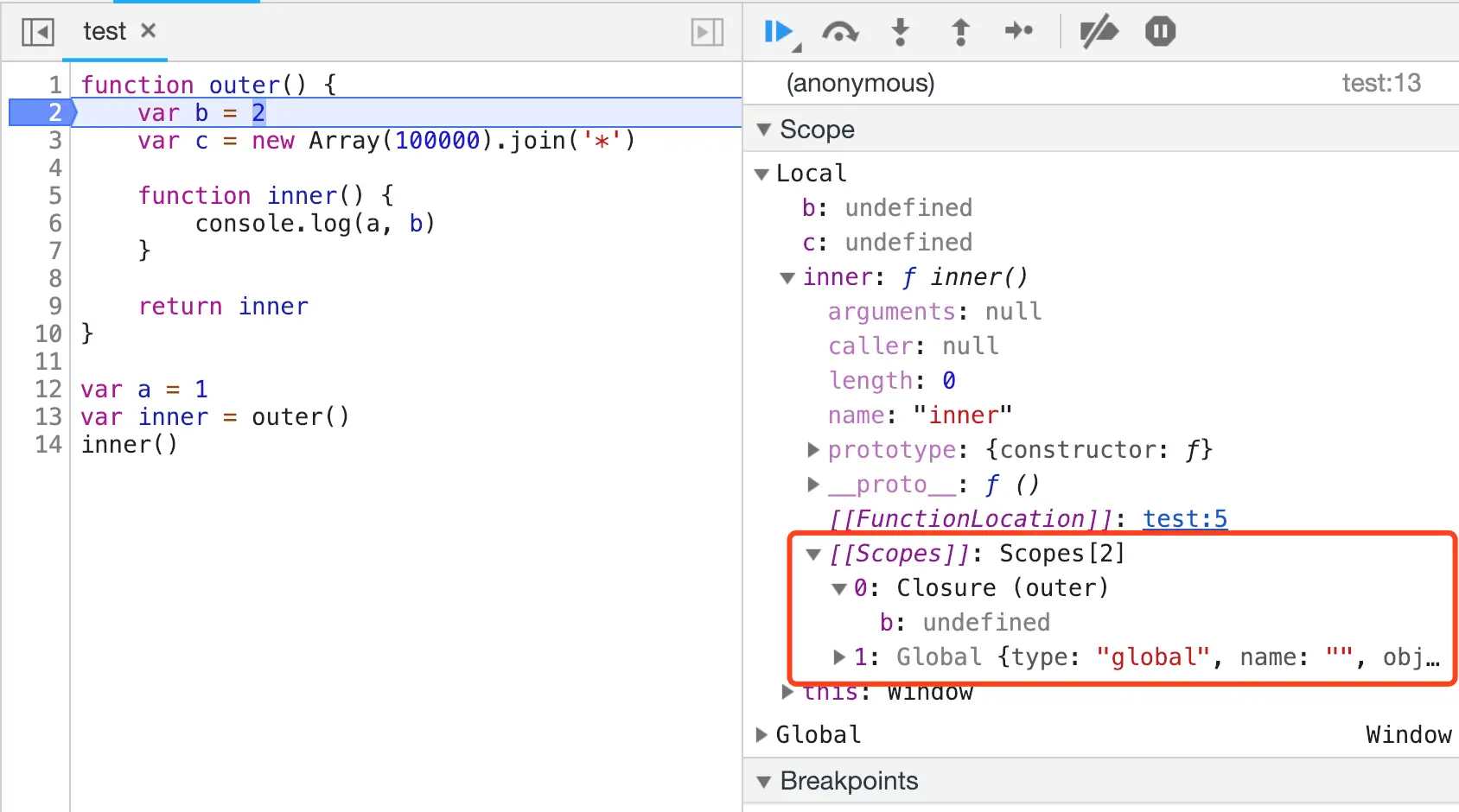 那么,你可能会想,我们在确定 inner 函数 [[scope]] 属性的时候,只引用 inner 函数体内用到的变量不就好了吗?实际上,JS引擎 和你一样聪明,就是这么干的,在 Chrome 调试工具下: