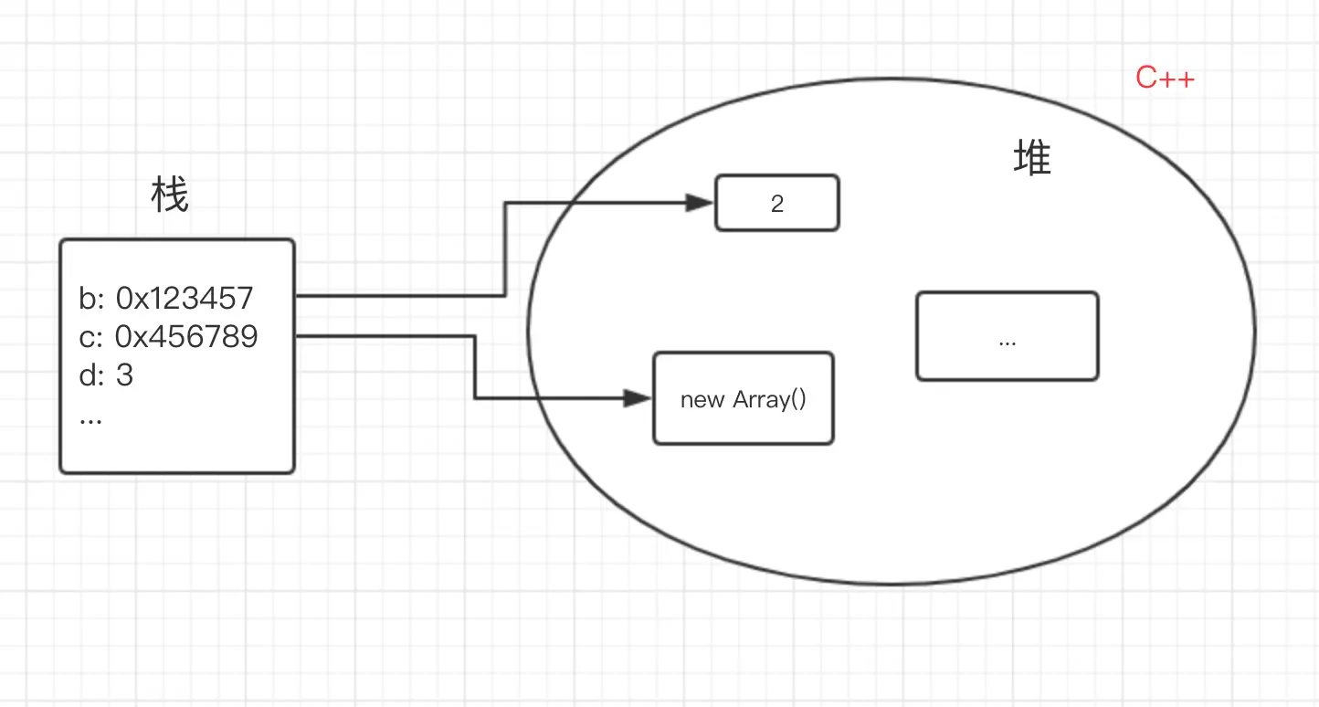 那变量 c 呢,你可以认为它是一个 Real Local Variable,只是在栈上存的是指向这个 new Array() 的内存地址,而 new Array() 的实际内容是存在堆上的。