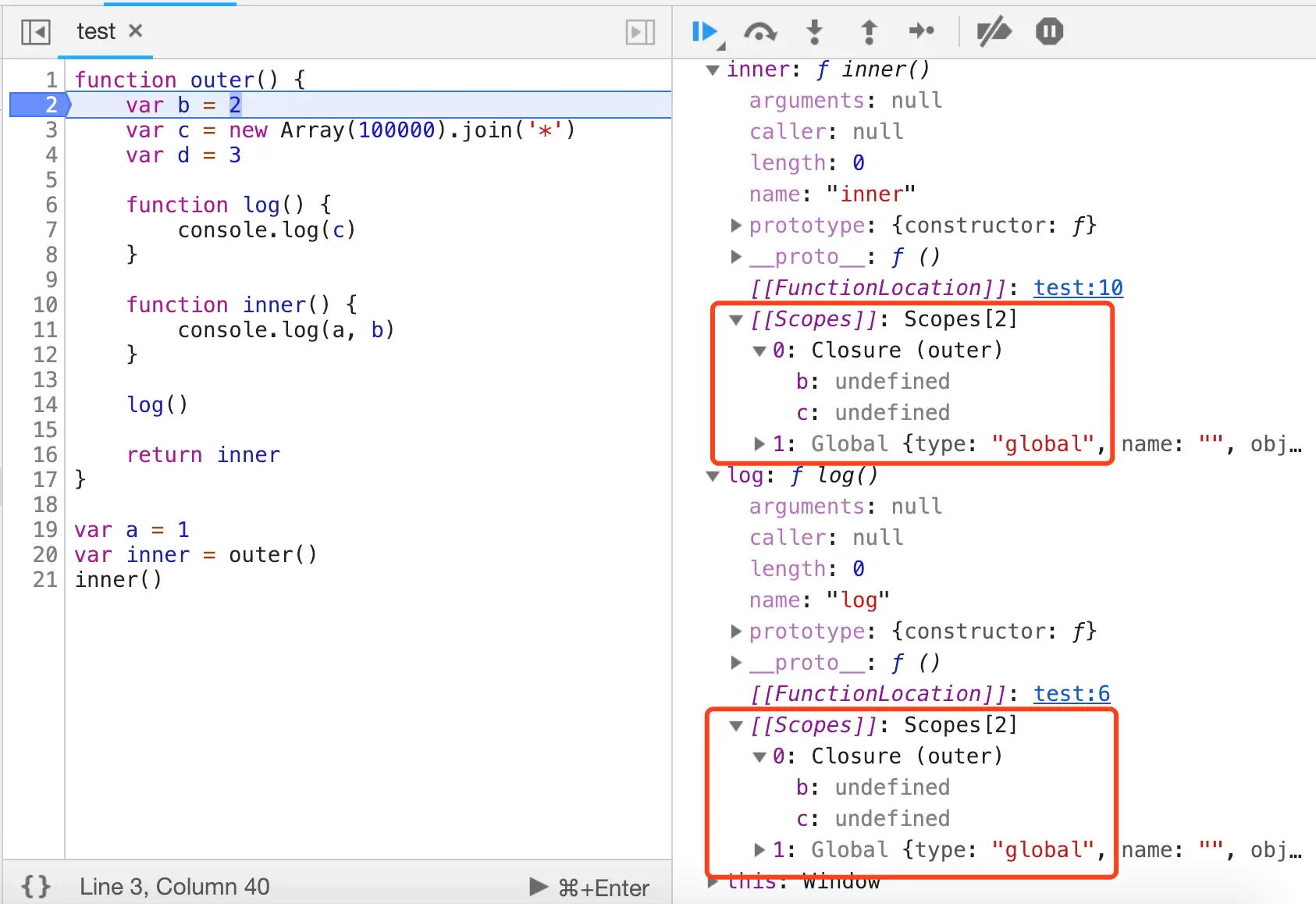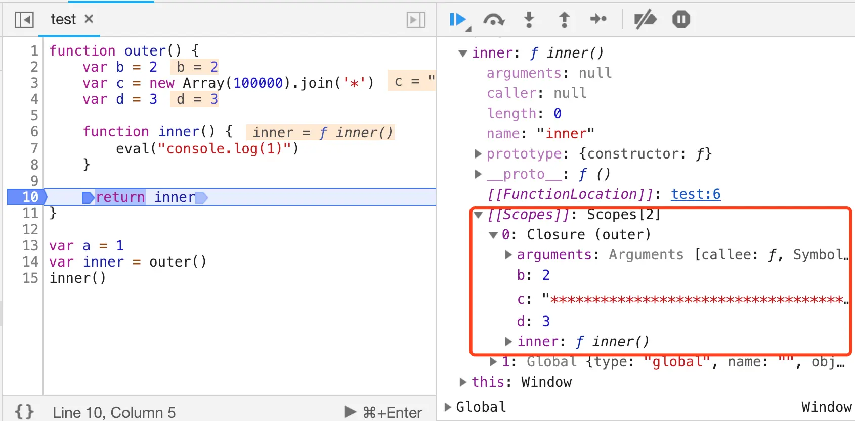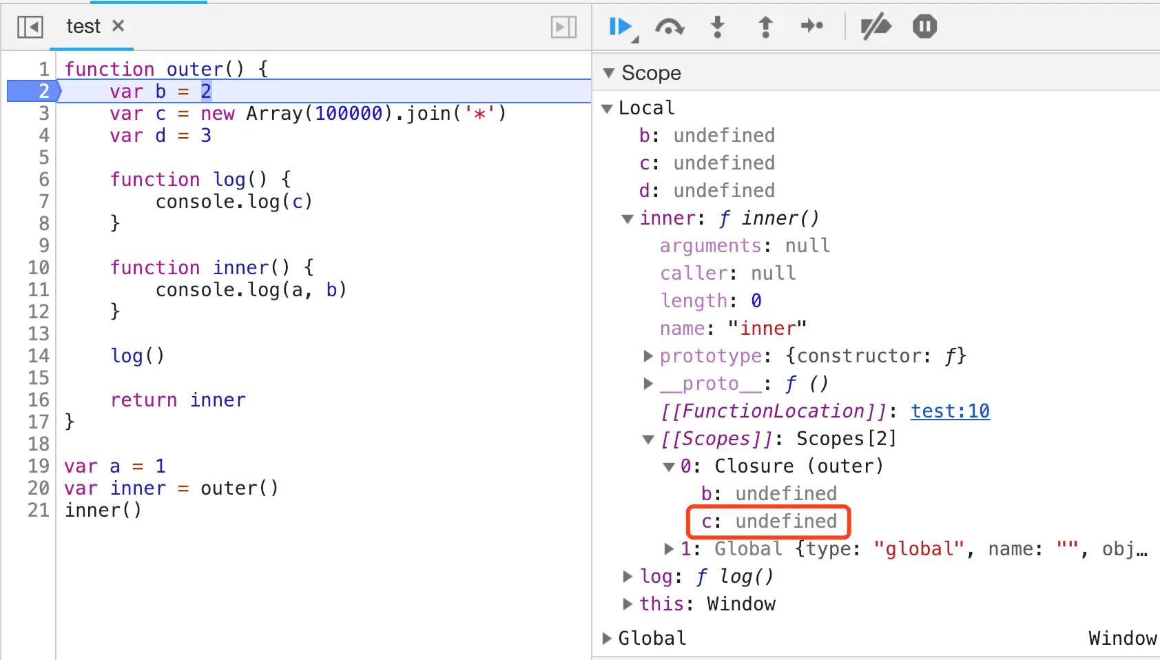 咦,我们可以看到 inner 函数中的闭包中竟然包含了变量 c!但是 inner 函数中并没有用到 c啊,你可能隐隐发现了什么,是的,我们在 log 函数中引用了变量 c,这竟然会影响到 inner 函数的闭包。