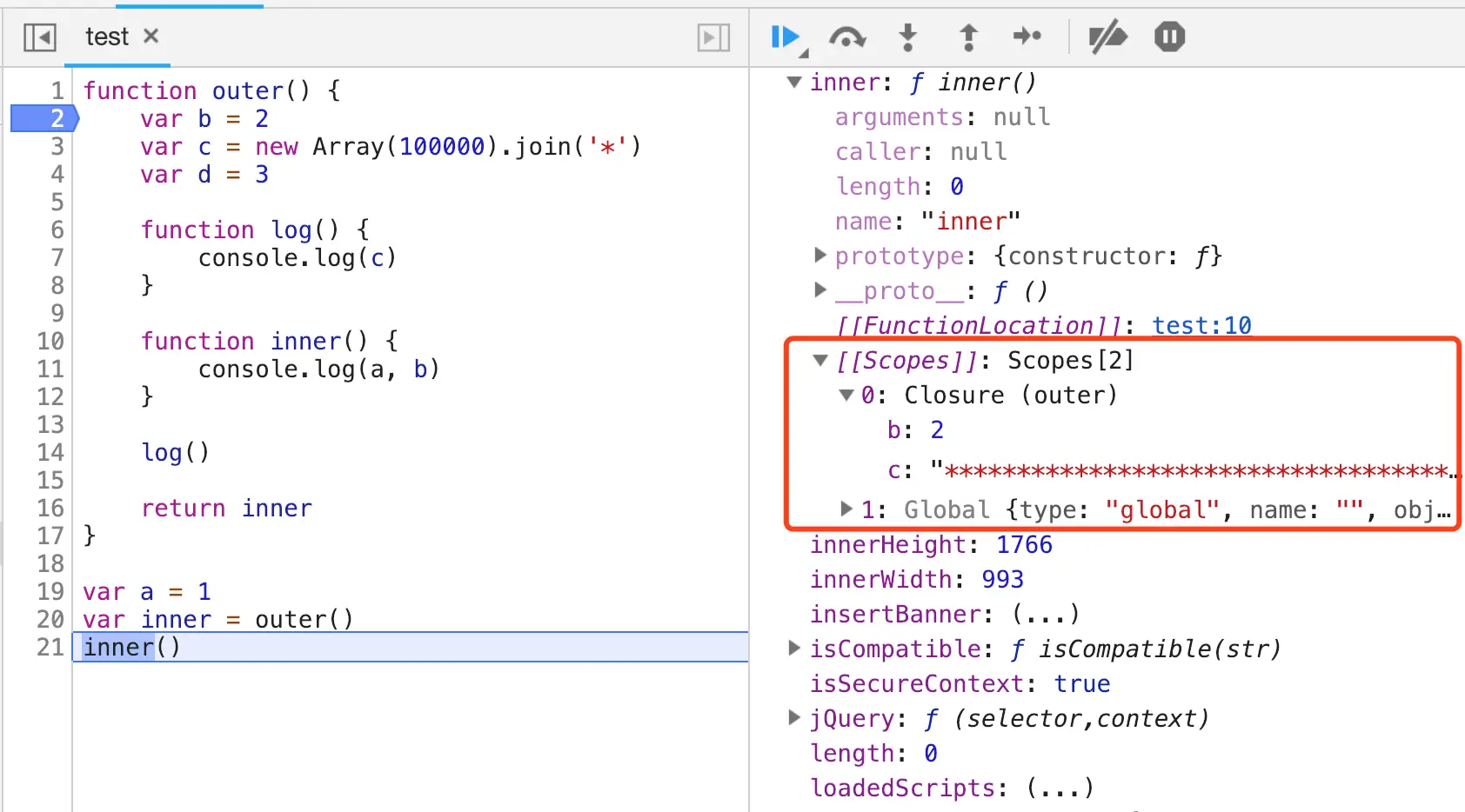 这里,我们只是加了一个 log 函数,并将变量 c 打印出来。对于 inner 函数来说,并没有什么改变,果真如此吗?我们看下 Chrome 调试工具下作用域和闭包相关信息。