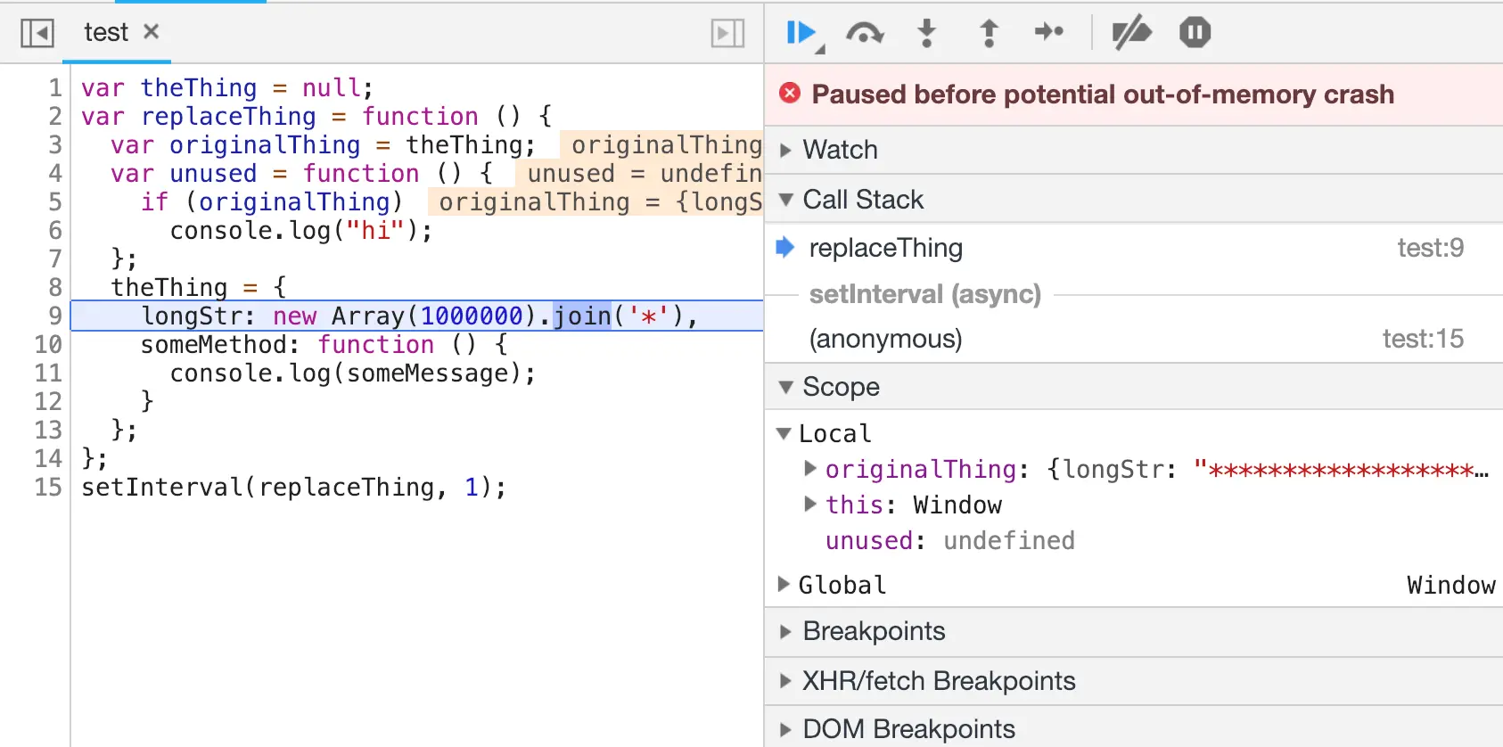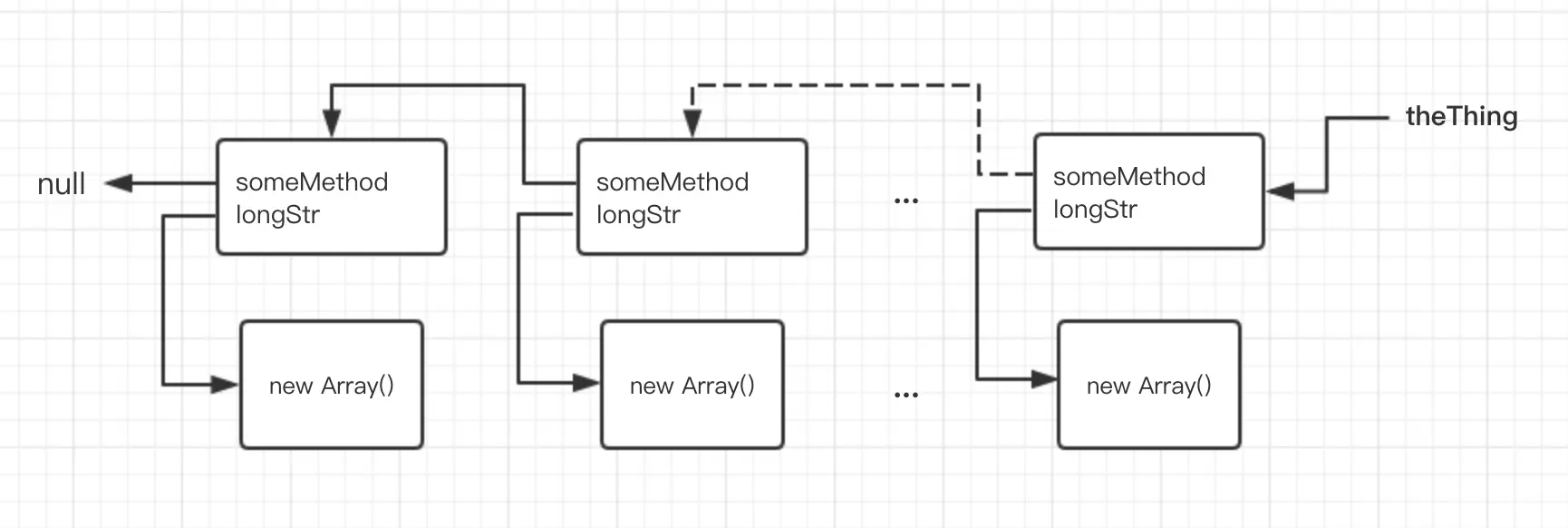 unused 函数引用了 originalThing ,由于共享闭包的特性,theThing.someMethod 函数的闭包中也包含了对 originalThing 的引用,而 originalThing 是上一个 theThing,也就是说下一个 theThing 引用者上一个 theThing,形成了一个链。并随着 setInterval 的执行,这个链越来越长,最终导致内存泄露,如下: