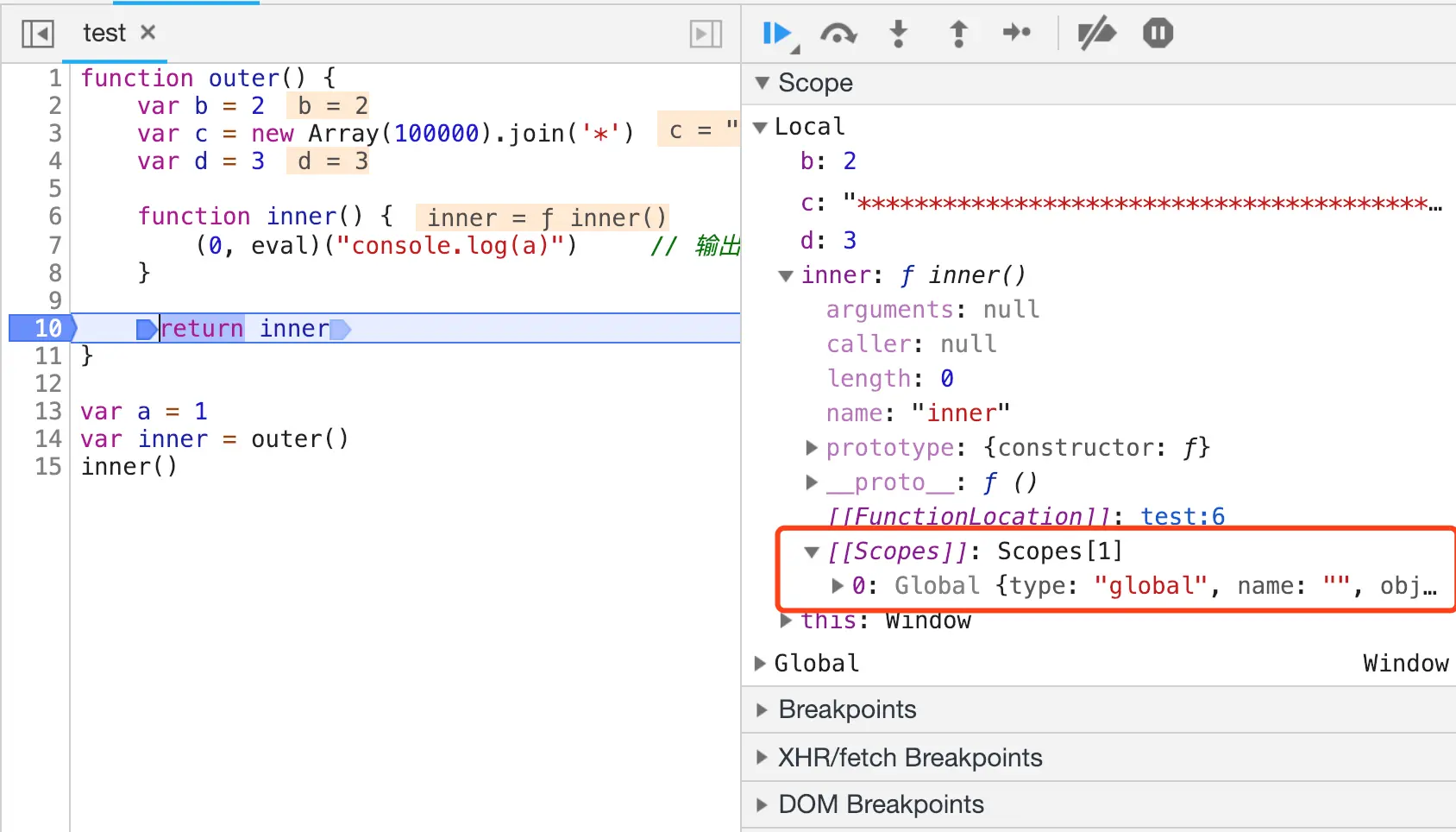 可以看到,并没有对变量 c 的引用,我们可以认为 inner 函数 [[scope]] 属性为: