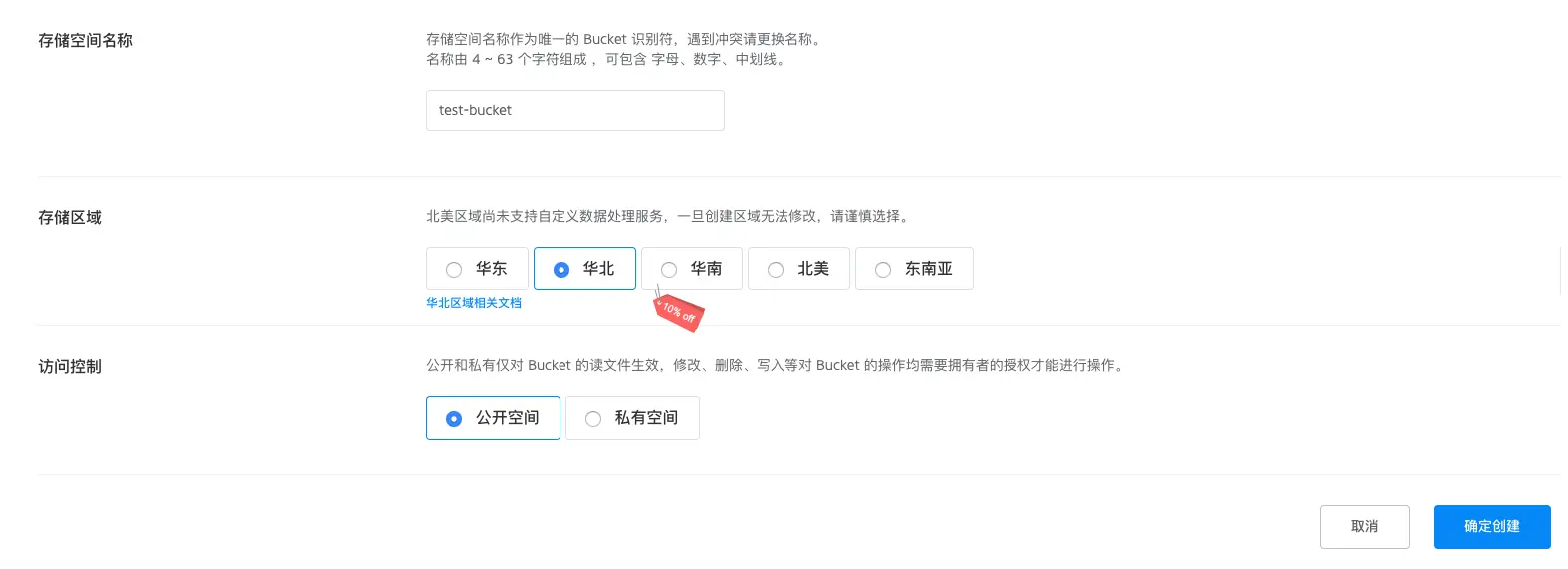 选择新建存储空间,填写存储空间信息,点击确定创建。