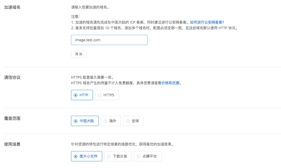 点击绑定域名,在这里选择普通域名,填入一个已进行公安备案的二级域名作为空间域名。此处已image.test.com为例。其它选项可根据个人需求进行具体调整。