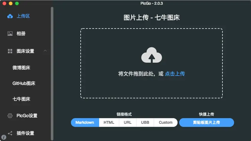在日常的Markdown写作中,使用图片是必不可少的,所以靠谱的图片存储服务和上传工具显得格外重要。图片存储上我一直使用七牛,个人用户拥有10GB的免费存储空间,并且拥有很成熟易用的图片处理引擎,可以说是个人博客的不二之选。而上传工具的选择一直是我比较头痛的地方。手动打开七牛上传对于我这种懒人是不可能的,而基于MD编辑器的内置图片上传接口不够灵活(小书匠、Typora等),而当初多个工具使用下来iPic无意识Mac端用户体验最佳的工具,但是,他月费的模式并不适合我这种低频使用者。所以,当初我折中的使用了一个小网站叫极简图床。然而,最近他也挂掉了。重新搜索,我发现了今天要介绍的一个工具PicGo。其使用electron-vue进行编写,具有全平台的适用性。体验上也跟iPic无二并支持多个图床的配置,甚至支持插件的编写。言归正传,下面介绍七牛云+PicGo的图床解决方案。
