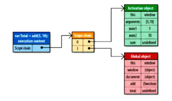 - 创建函数时,会填入一个单独的全局对象到被创建的作用域链(用于标识符解析)中,此全局对象包括访问this对象,window对象,document对象,本身的接口。同时也是创建一个被称为“激活对象”填入到作用域链中,此对象包括可访问this,函数参数,函数内部局部变量的接口。