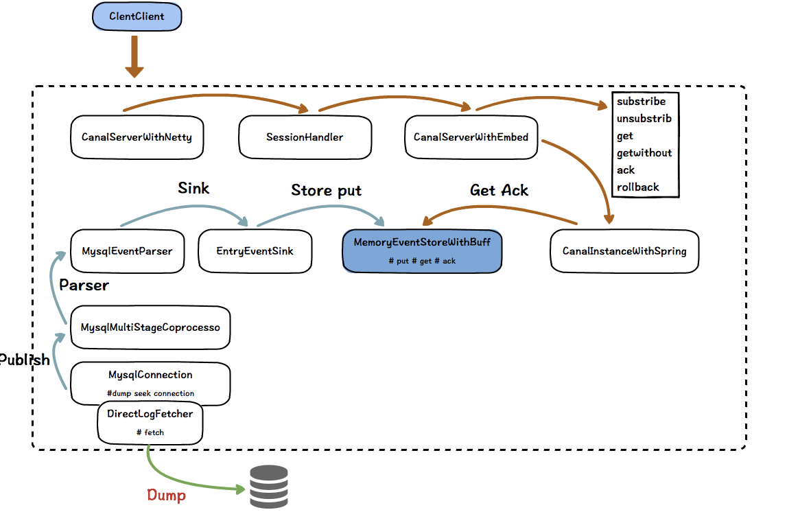 从 Myslq 的角度看,MysqlConnection 从 Myslq dump 数据,交给 parser 解析,parser 解析完,交给 sink,sink 处理完,交给 store 保存,等待 client 前来获取。