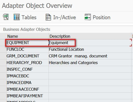 解决方案就是到CRM系统里,使用事务码R3AC1进入Adapter object设置页面,找到EQUIPMENT: