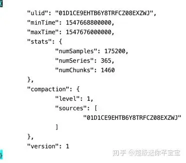 meta.json文件记录了Chunks的具体信息, 比如新的compactin chunk来自哪几个小的chunk。 这个chunk的统计信息,比如:最小最大时间范围,时间线,数据点个数等等